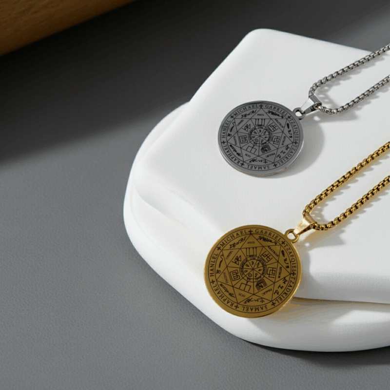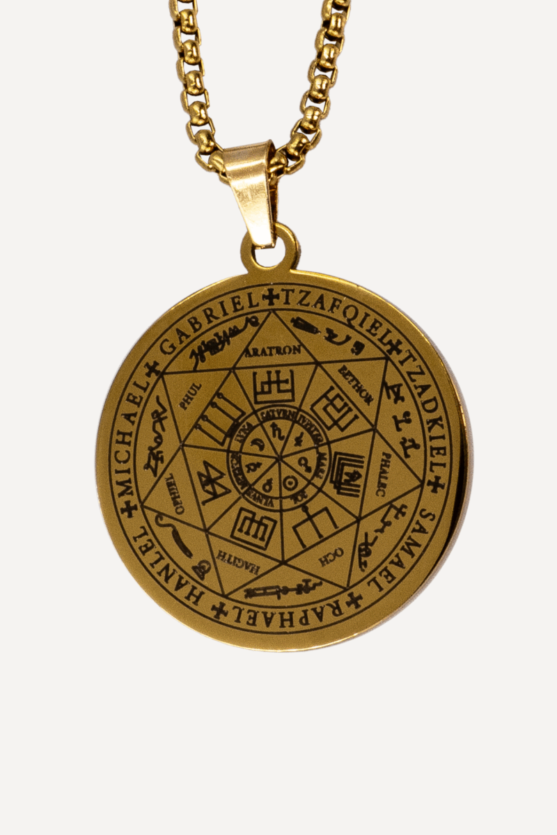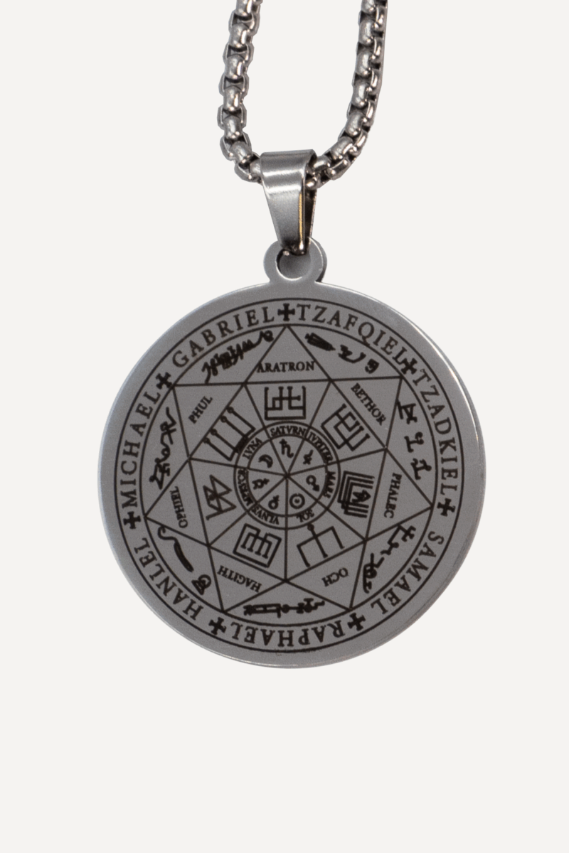 Dieses kraftvolle Medaillon trägt das heilige Siegel der 7 Erzengel – Michael, Gabriel, Raphael, Haniel, Tzafqiel, Zadkiel und Samael. Jeder Erzengel verkörpert eine kosmische Frequenz, die Dich in Deinem Alltag begleitet, stärkt und schützt, es ist in silberfarbener oder goldfarbener Edelstahl-Ausführung erhältlich.