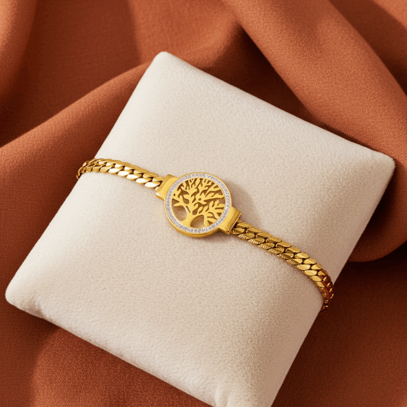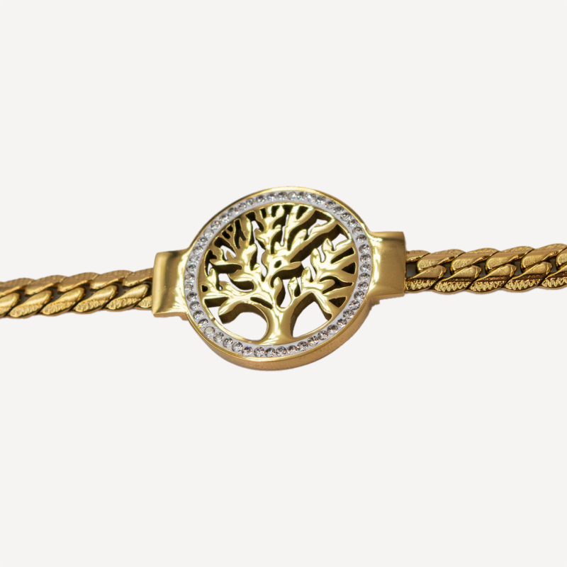 Entdecke die kraftvolle Energie des „Baumkraft“-Armbands – ein wunderschönes Panzerarmband aus Edelstahl, das in edlem Goldton erstrahlt und mit funkelnden Strasssteinen verziert ist. Dieses Armband verkörpert die kraftvolle Verbindung von Erde und Himmel, indem es die Weisheit und Stärke des Lebensbaums mit modernen, eleganten Akzenten kombiniert.