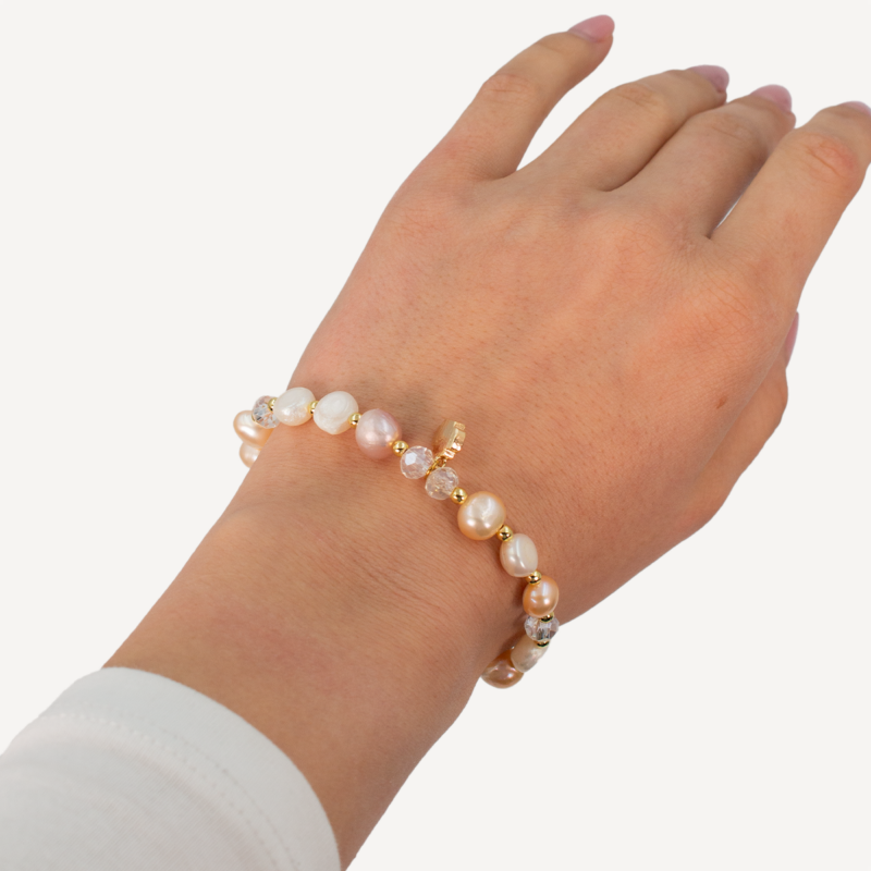 Material: Süßwasserzuchtperlen, Glasperlen, Messing, Gummiband