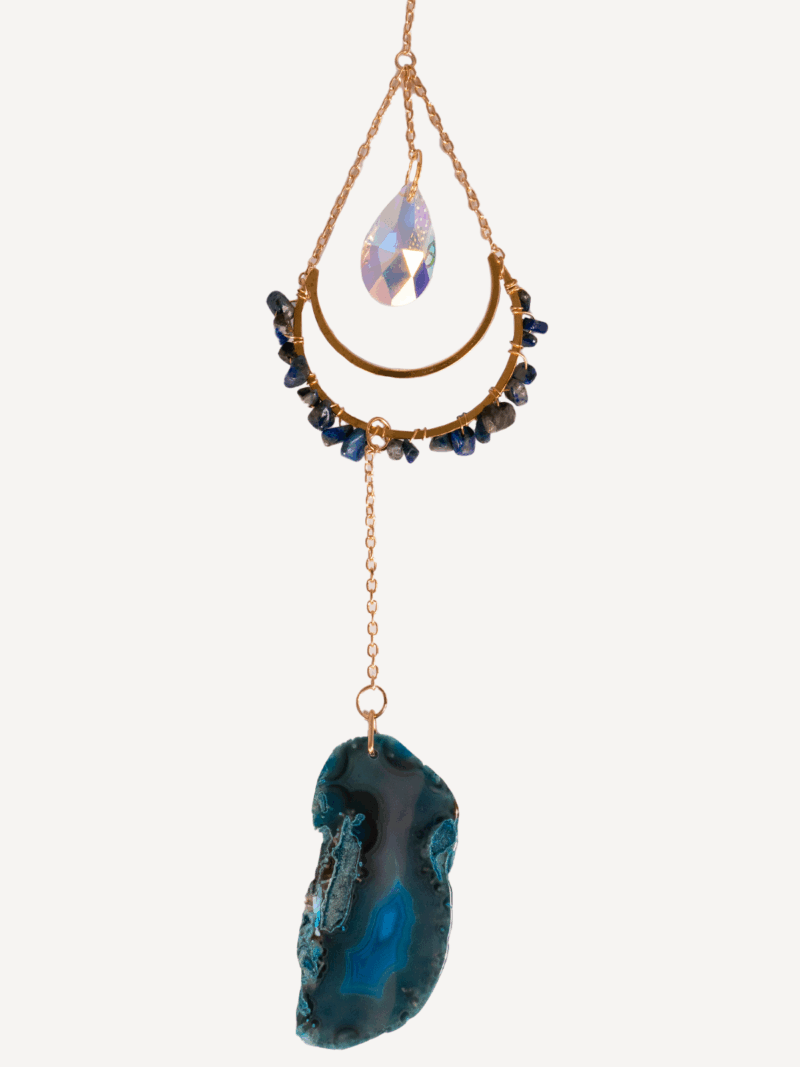 Der gläserne Tropfen in der Mitte schimmert wie ein Sternentor – klar, lichtvoll und erhebend. Unterhalb vollendet die Achat-Scheibe das Ornament und verbindet die Leichtigkeit des Himmels mit der Kraft der Erde. So entsteht ein harmonischer Fluss aus Inspiration, Klarheit und Stabilität.