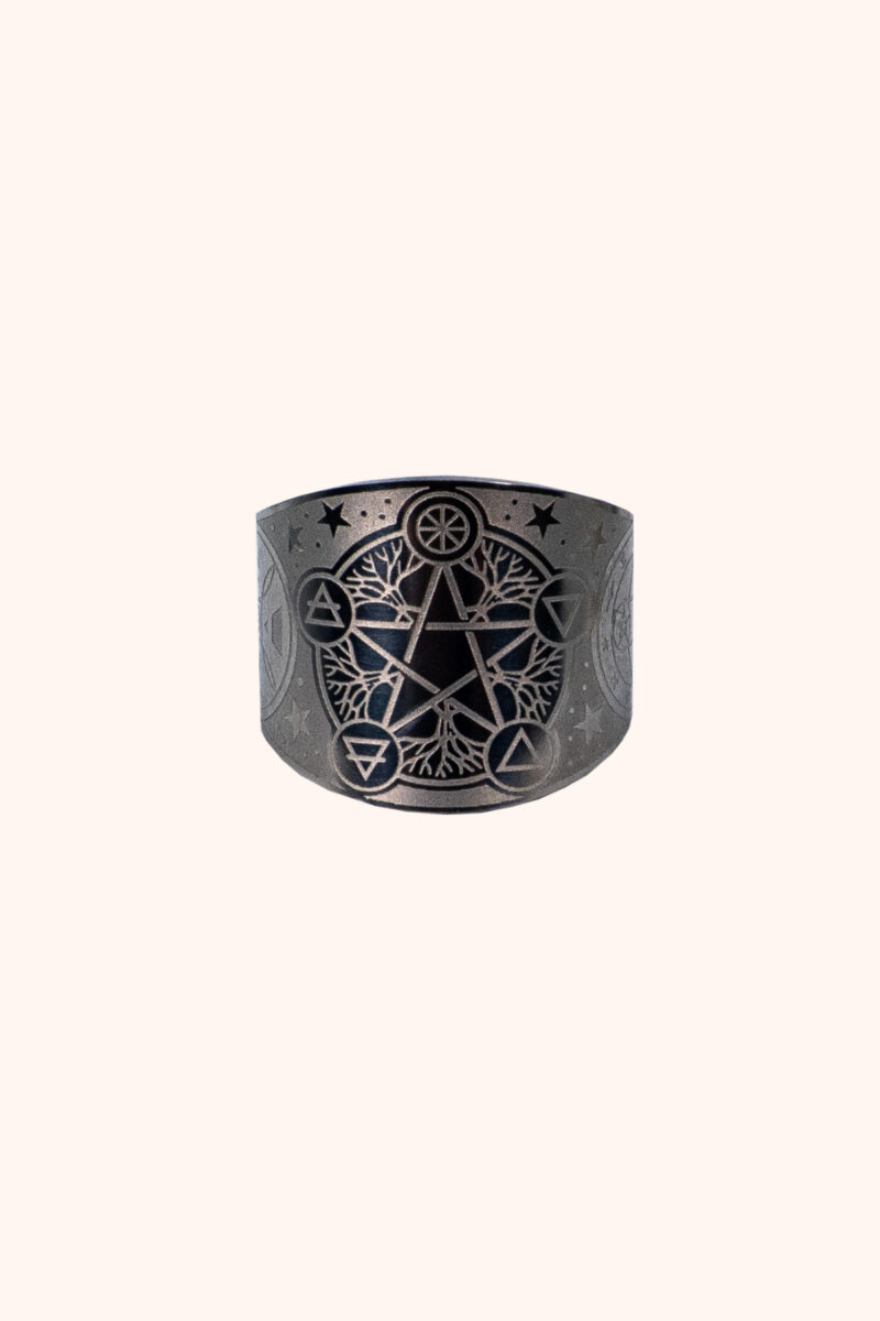 Im Zentrum steht der Stern der fünf Elemente – eingebettet in den Baum des Lebens. Himmel und Erde, Geist und Materie verbinden sich in einem kraftvollen Schutzkreis.