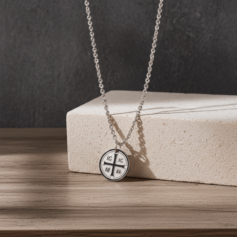 Das Medaillon trägt das uralte byzantinische Siegeskreuz mit der Inschrift IC XC NI KA — ein heiliges Symbol für „Jesus Christus siegt“. Es erinnert dich daran, dass Licht, Glaube und Liebe immer über alles Dunkle triumphieren.