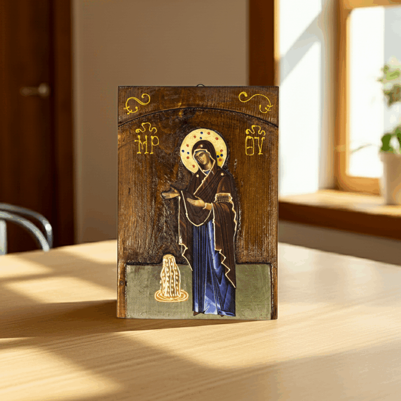 Mutter Maria, beschenkt Dich reich mit dieser wundervollen Energie des Wohlstands und der Fülle im Leben. Sie sagt, es ist so wichtig für Deine spirituelle Entwicklung auch die „irdischen “ Aspekte in die Göttliche Ordnung zu bringen. Das bedeutet, auch im Bereich Wohlstand und Fülle soll es Dir besser gehen, gerade zu solch schwierigen Zeiten, wie wir sie jetzt durchleben. Es sollte nicht sein, dass wir für unsere spirituelle Entfaltung und Bewusstwerdung leiden. Vielmehr sollen wir ein friedvolles Leben manifestieren können, um uns auch mehr auf die geistige und lichtvolle Ausdehnung fokussieren können. Diese Ikone ist von Mutter Maria gesegnet und bechannelt und verströmt, wo auch immer sie ist, die Energien des Wohlstands und der Fülle. Lasse Dich tragen und erlaube Dir diese Frequenzen zu empfangen.