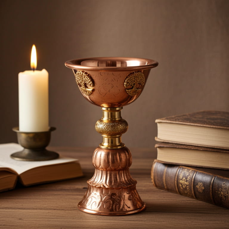 Der Kelch ist eine Mischung aus Eleganz und Spiritualität. Er ist mit dem dreifachen Mond oder dem Baum des Lebens verziert und eignet sich perfekt für Reinigungen oder als wunderschönes Altarobjekt. Sein reicher Kupferton verleiht Deinem heiligen Raum eine warme und einladende Atmosphäre.