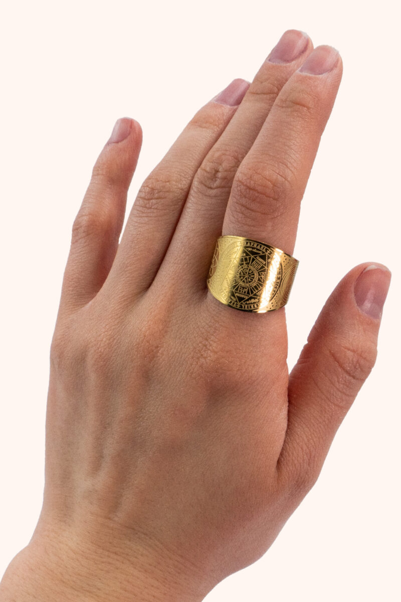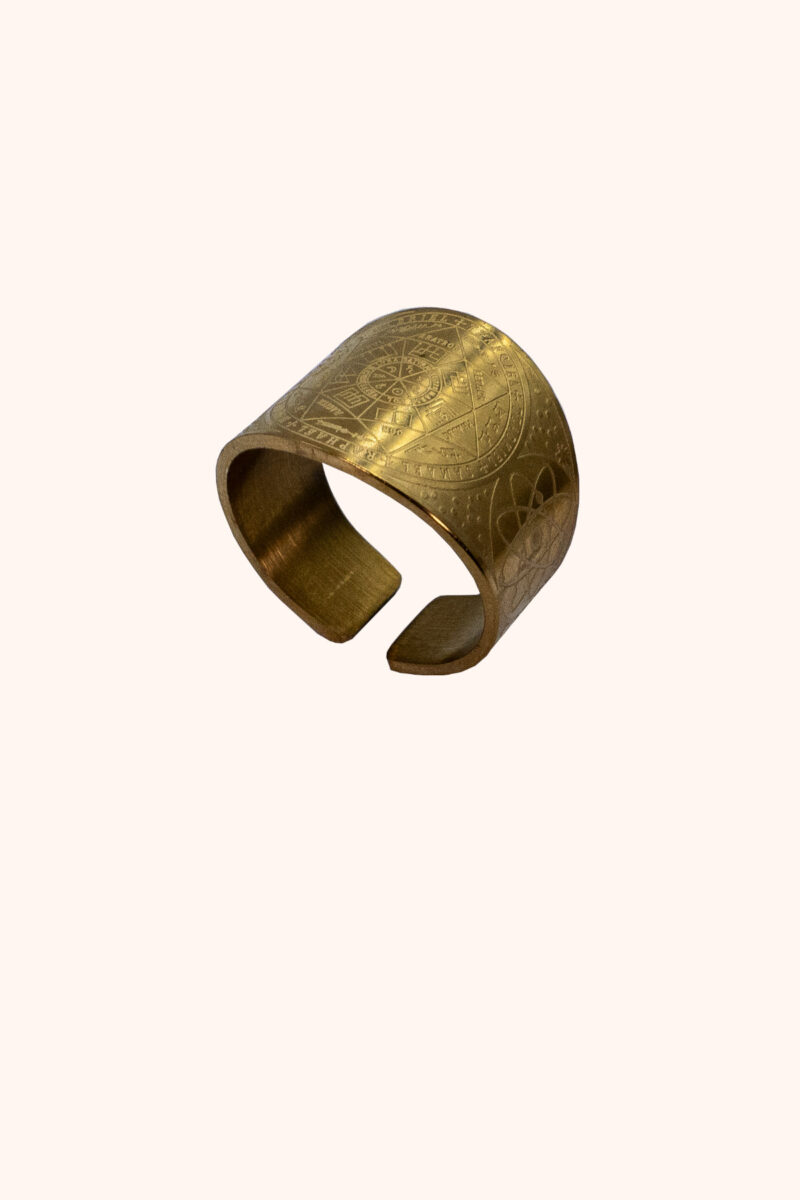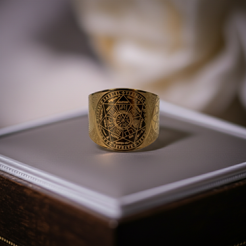 In seiner goldenen Ausstrahlung verbindet sich die Kraft der sieben Erzengel mit königlicher Würde und göttlicher Ordnung. Die Gravuren wirken wie ein energetischer Schutzkreis – ein heiliges Feld aus Führung, Stärke und Licht.