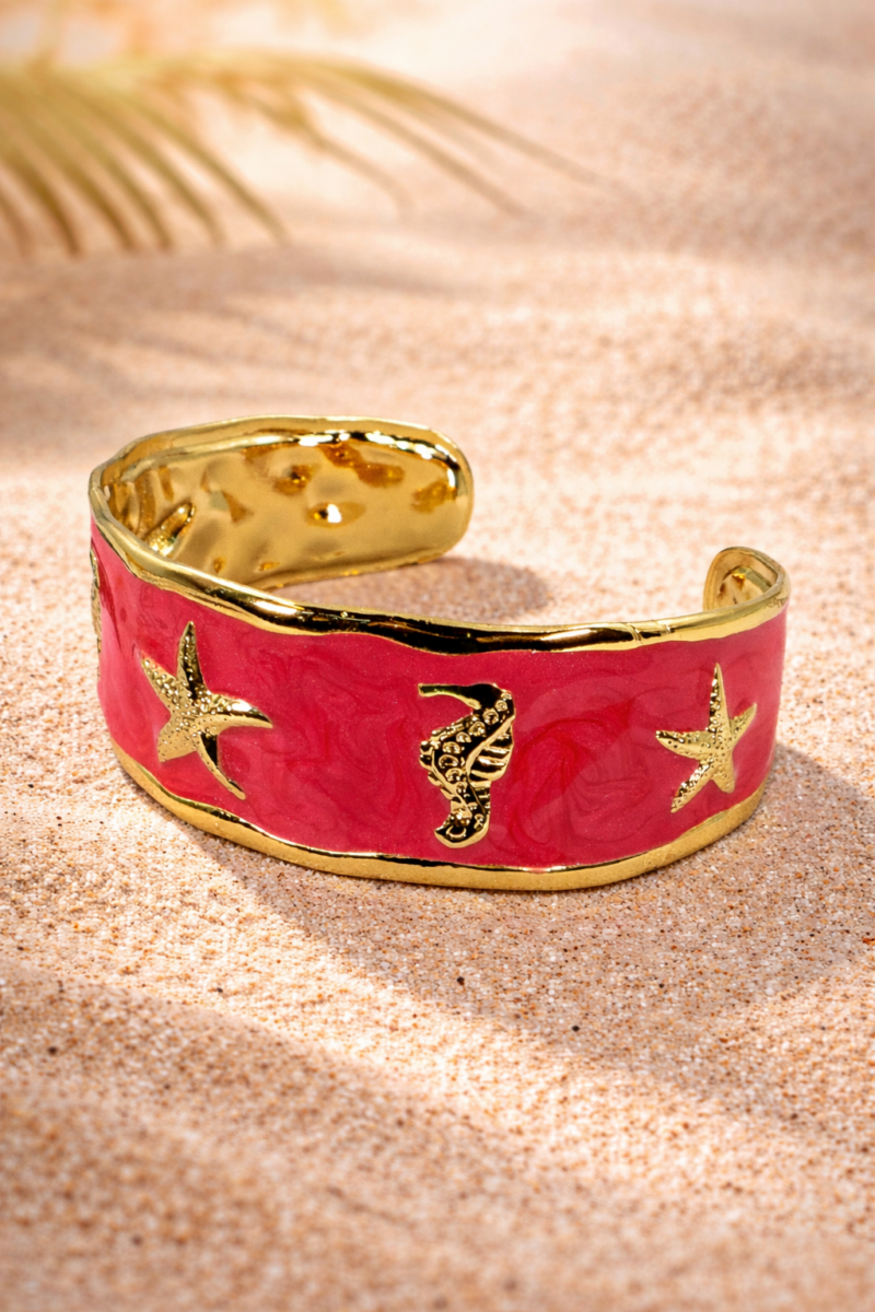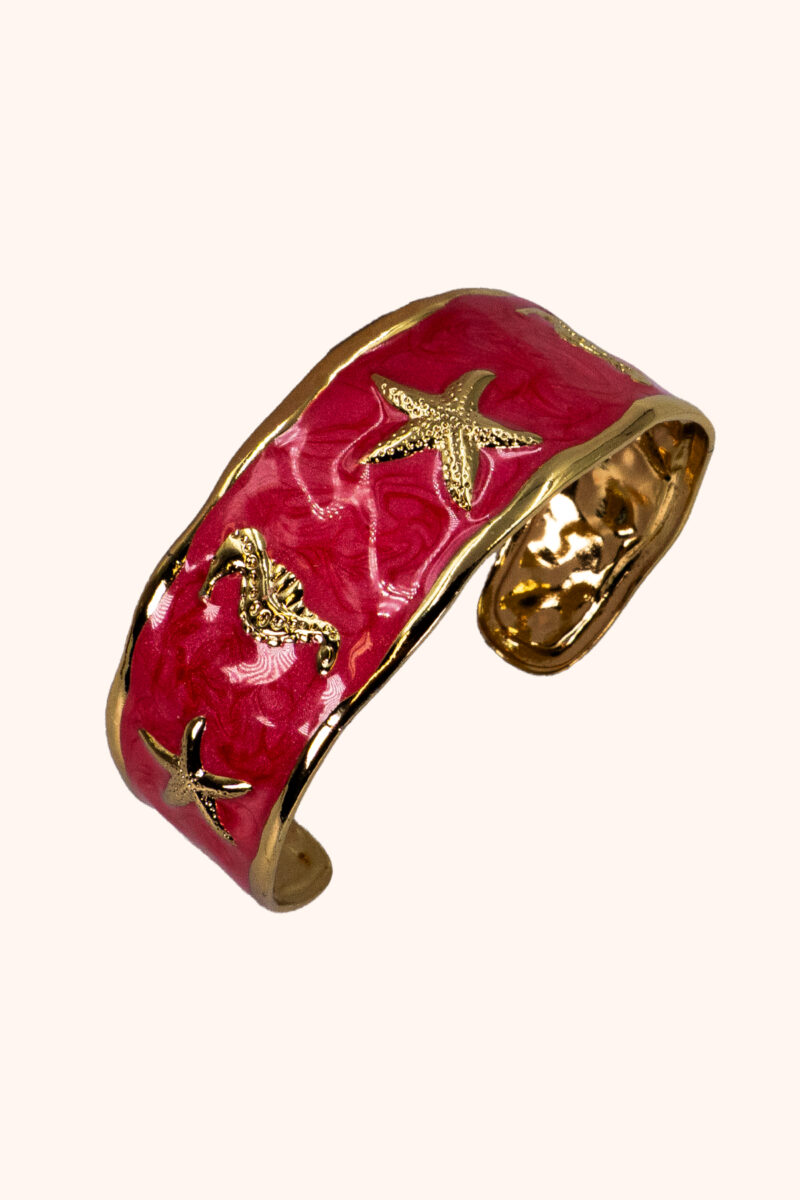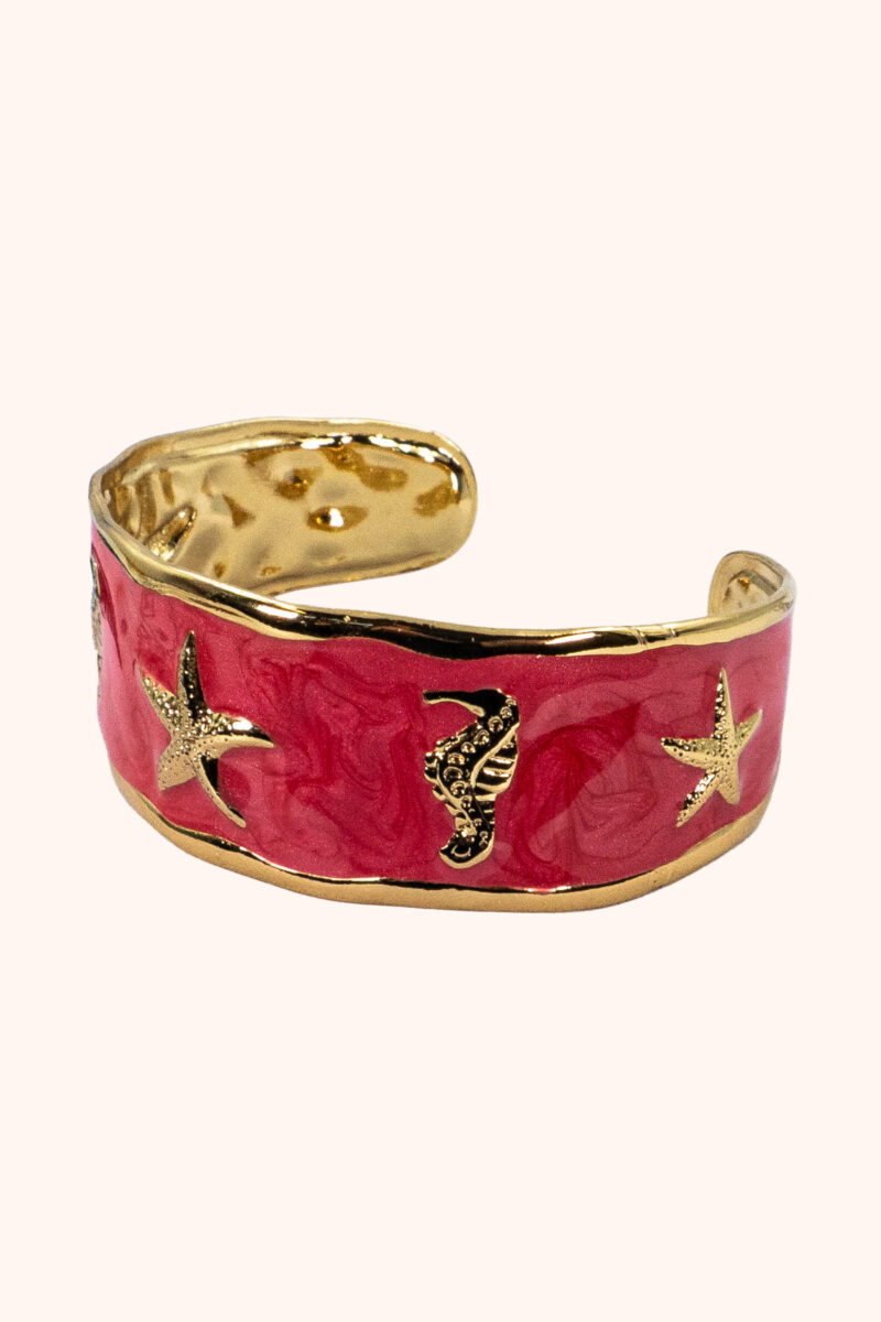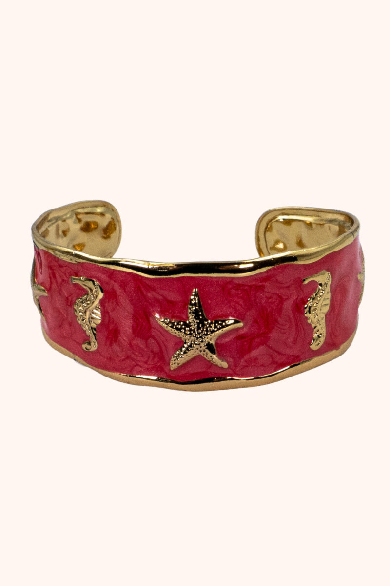 Das warme Rot erinnert an Korallenriffe – voller Leben, Bewegung und Kraft. Der goldene Seestern steht für Orientierung und innere Führung.