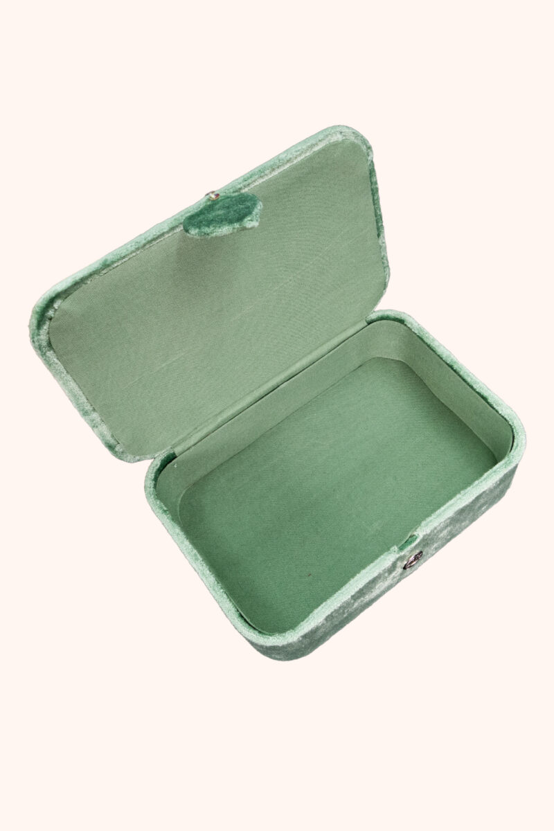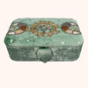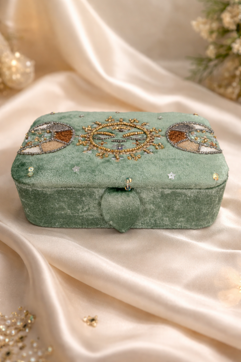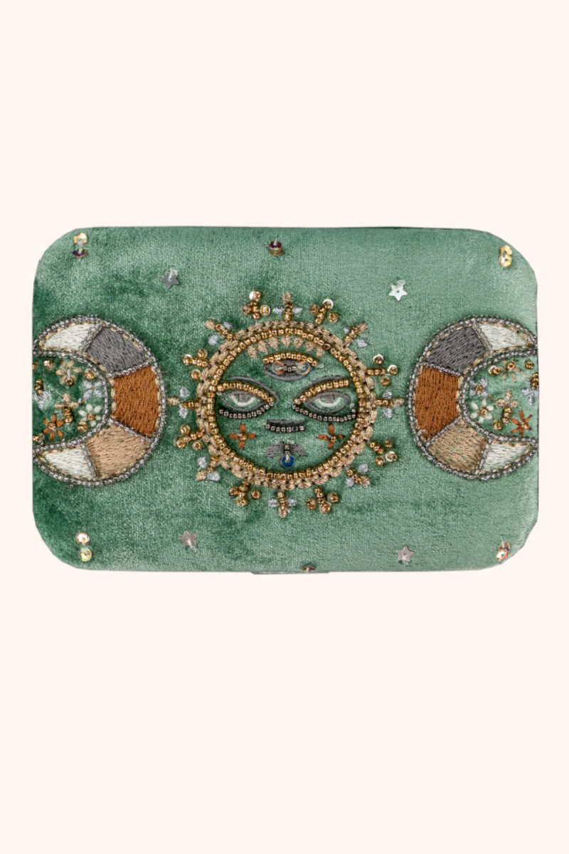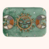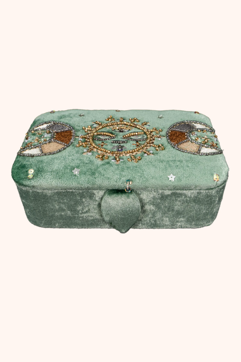 Der zarte Samt in sanftem Mintgrün erinnert an die Ruhe der Natur, an den Moment zwischen Tag und Nacht, wenn die Welt still wird und die Intuition zu sprechen beginnt. Auf dem Deckel entfaltet sich das geheimnisvolle Spiel der Mondphasen – Sinnbild für Wandel, Wachstum und die ewigen Zyklen des Lebens. In ihrer Mitte wacht ein mystisches Gesicht, umgeben von feinen goldenen Details, wie ein stilles Orakel, das deine inneren Geheimnisse behütet.