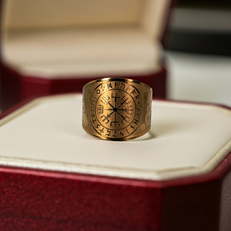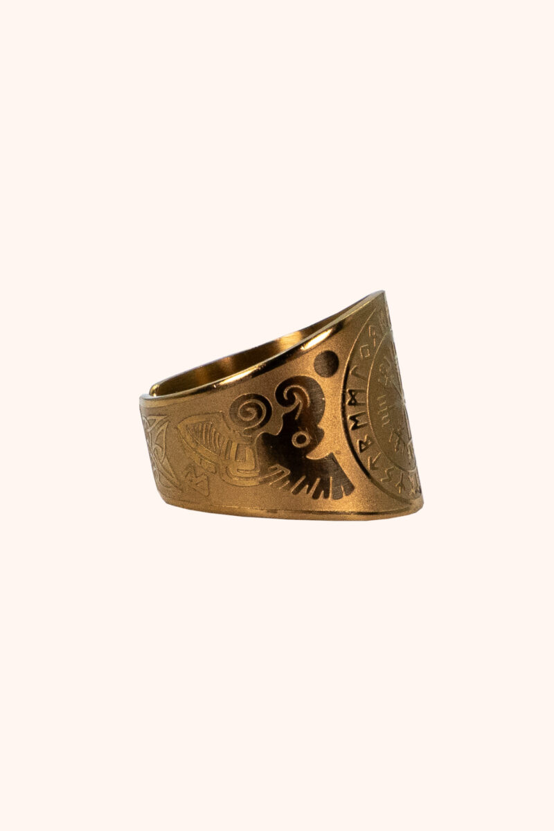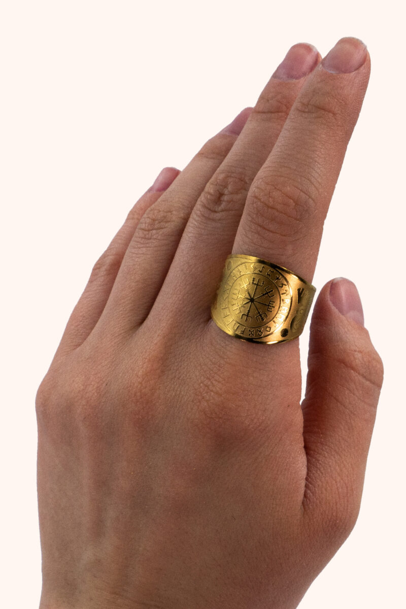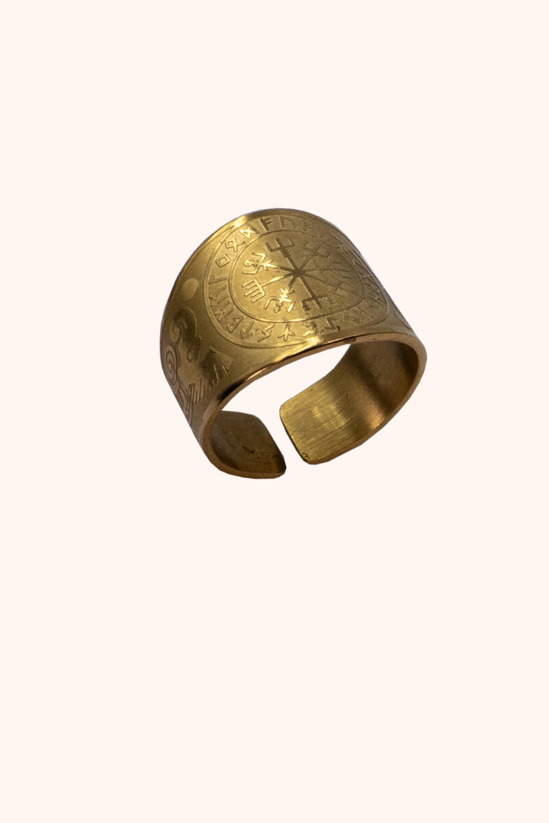 Dieser kraftvolle Ring aus Edelstahl in warmem Goldton ist mehr als ein Schmuckstück – er ist dein spiritueller Anker. Der eingravierte Kompass erinnert dich daran, dass deine Seele immer weiß, wohin dein Weg führt.