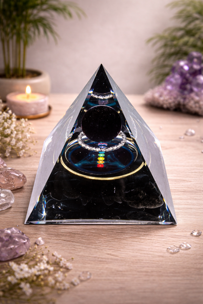 Diese Orgonit-Pyramide vereint transformierendes Harz mit natürlichen Obsidian-Chips im Inneren. Das Orgonit wirkt wie ein energetischer Wandler: Es nimmt dichte, stagnierende Schwingungen auf und bringt sie zurück in einen ruhigen, harmonischen Fluss. So entsteht ein Feld von Stabilität und Sammlung – spürbar, besonders in Arbeits- oder Praxisräumen.