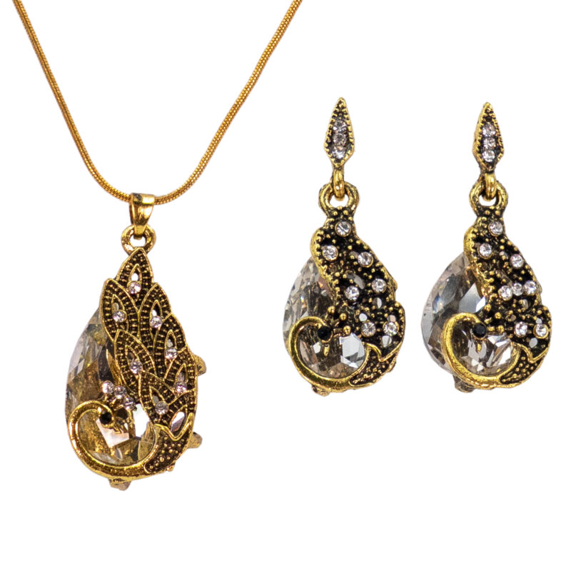 Der „Pfau des Lichts“ steht für Reinheit, Klarheit und zeitlose Schönheit. Die antik-goldfarbene Metalllegierung bildet eine warme Bühne, auf der das Pfauenmotiv mit seinen funkelnden Steinen majestätisch zur Geltung kommt. Dieses Set aus Kette und Ohrringen wirkt wie ein fein geschnittenes Lichtbündel – dezent und doch beeindruckend präsent.