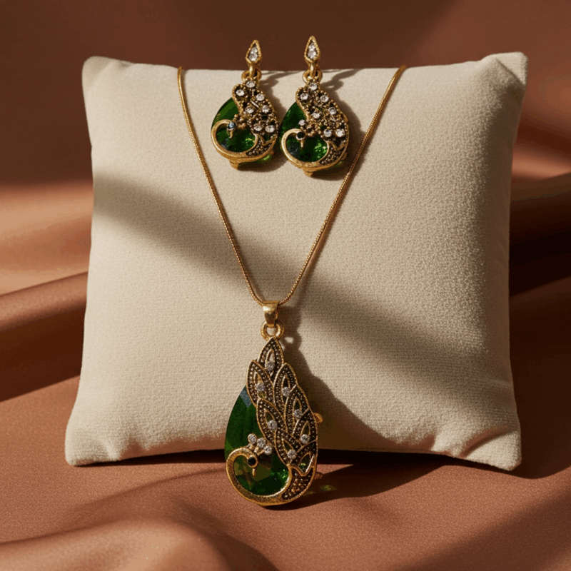 Im Zentrum funkelt ein großer grüner Stein – Symbol für Wachstum, Lebendigkeit und Harmonie. Er erinnert an die Tiefe der Wälder und das satte Grün der Natur. Umrahmt von weißen Strasssteinen, die wie Lichtstrahlen durch Baumkronen glitzern, entfaltet sich der Pfau in seiner ganzen Anmut. Das Zusammenspiel von Grün, Weiß und Antik-Optik verleiht dem Set eine Aura von natürlicher Eleganz und geheimnisvoller Schönheit.