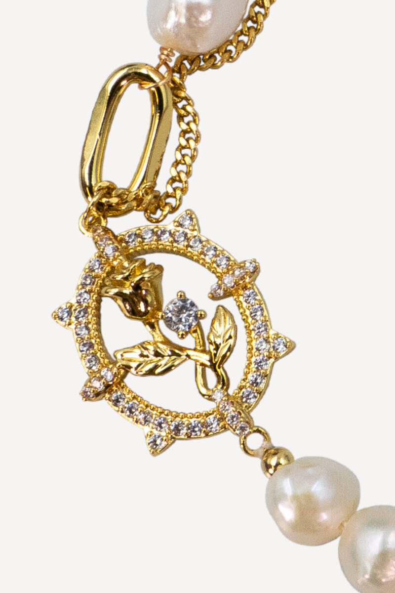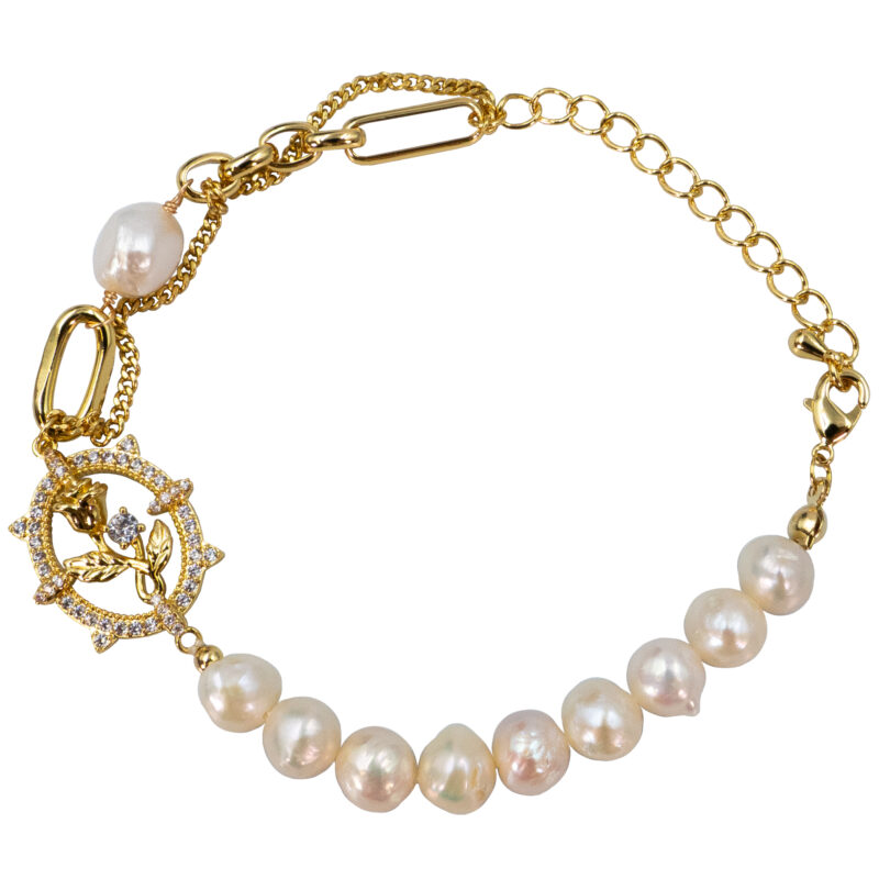 Das Rückkehr der Seele Armband vereint tiefe Symbolik mit edler Schönheit. Neun Perlen liegen vereint – eine einzelne Perle steht frei, wie ein Teil, der sich entfernt hat. Doch die Rose im ovalen Ornament, besetzt mit funkelndem Zirkonia, symbolisiert Liebe und Heilung.