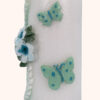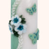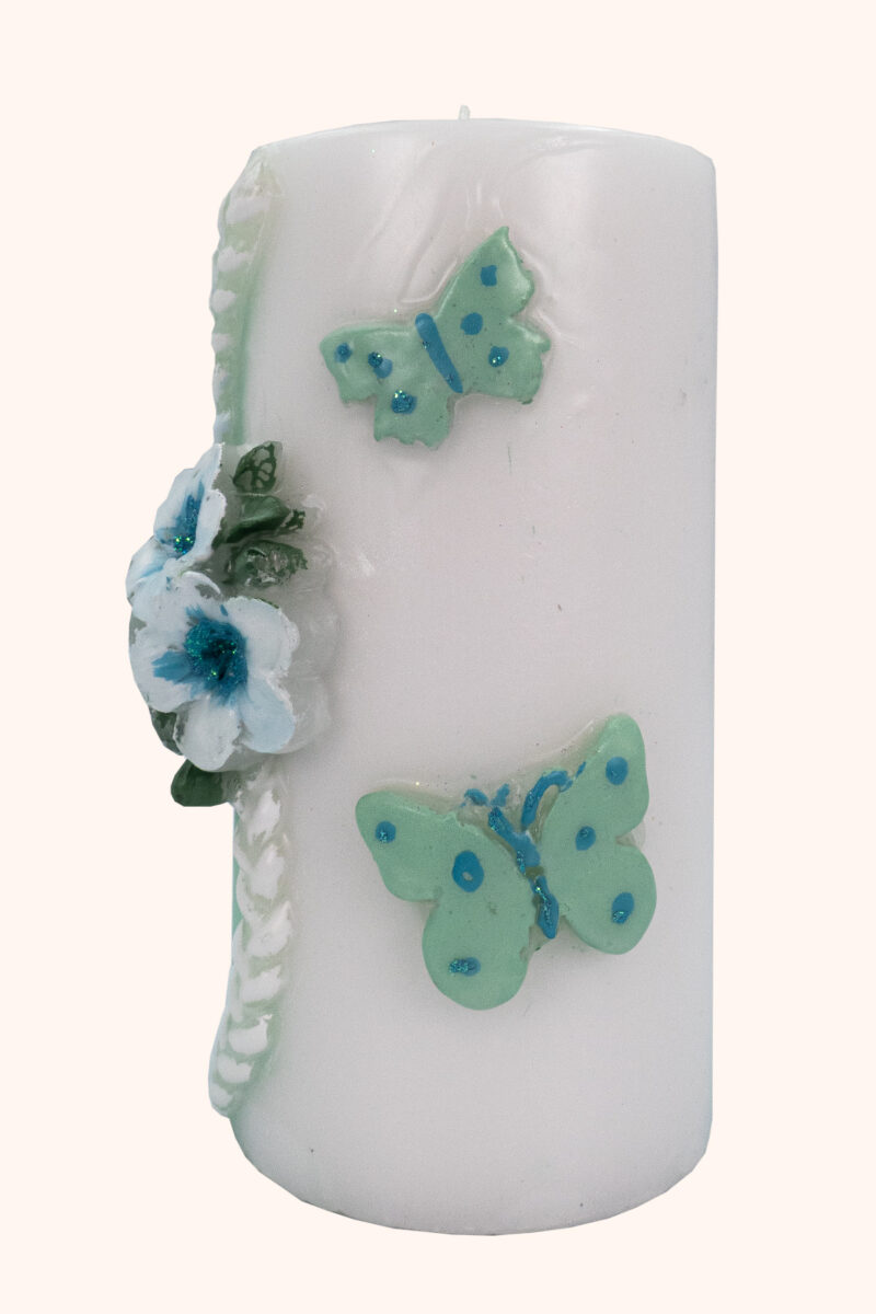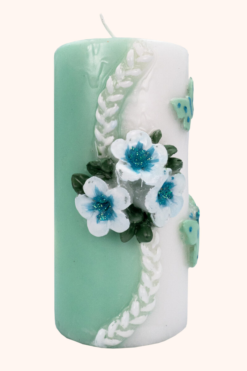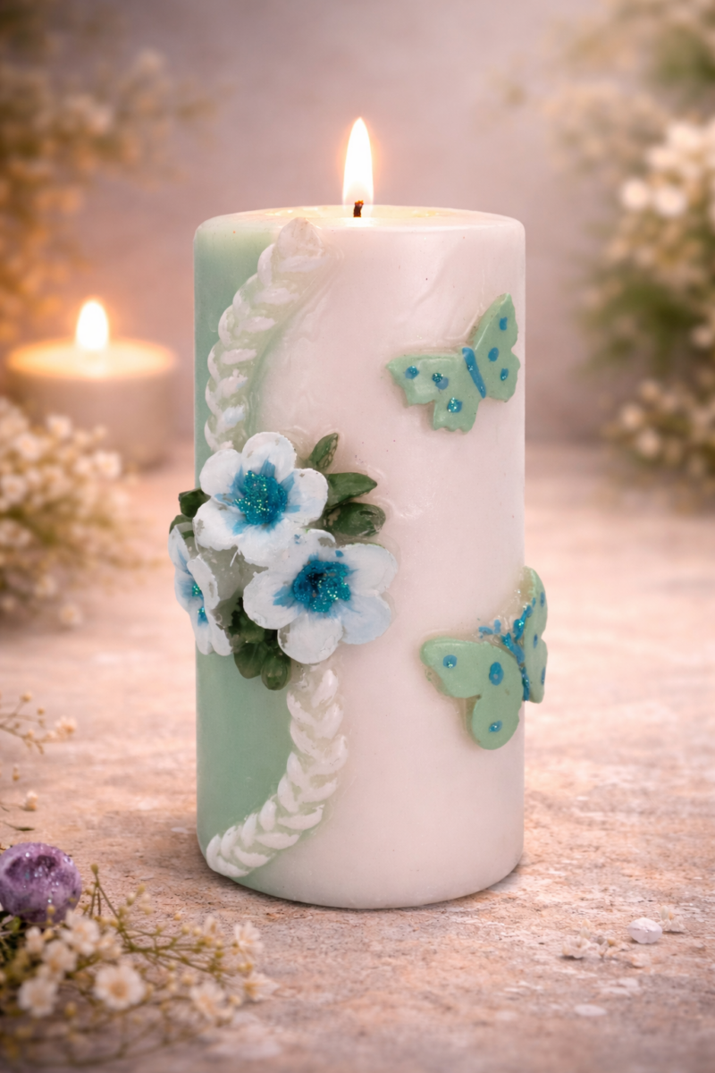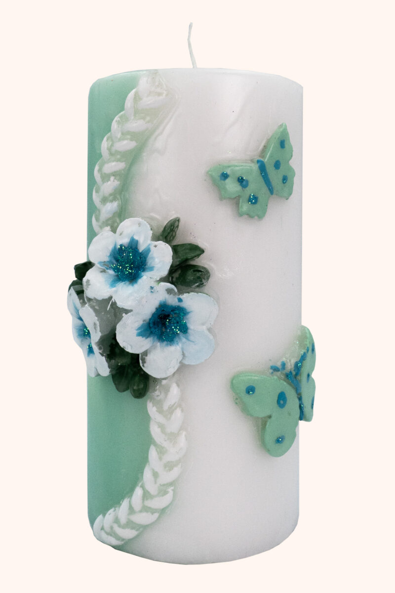Mit ihrem zarten Mintton, den edlen weißen Blüten und den filigranen Schmetterlingen in schimmerndem Türkis erinnert diese besondere Kerze an einen stillen Frühlingsmorgen – an den Moment, in dem sich etwas in deinem Leben neu entfalten möchte.