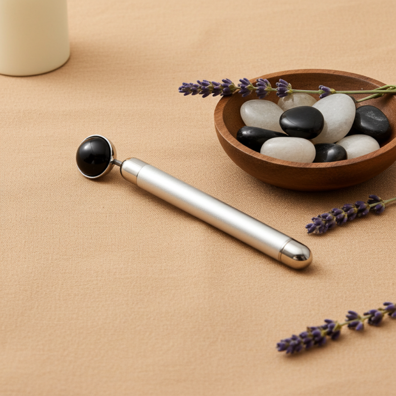 Der Schwarze Obsidian-Massagestab für die Gesichtsmassage ist ein feines, kraftvolles Werkzeug, um genau hier sanft loszulassen.