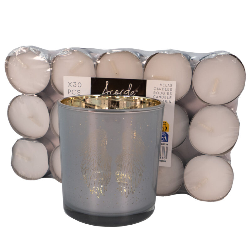 Das Engelslicht-Set vereint einen edlen Teelichthalter mit goldfarbenen Engelsflügeln und passende Teelichter, die zusammen eine Oase aus Licht, Wärme und Geborgenheit schaffen.
