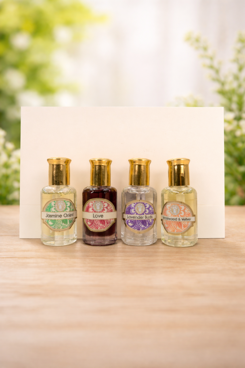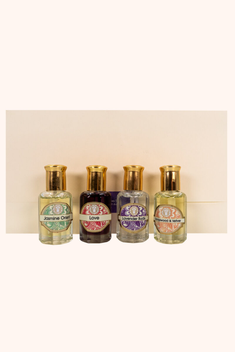 Das Ritual der vier Düfte vereint orientalische Sinnlichkeit, erdende Tiefe, herzöffnende Wärme und beruhigende Klarheit in einem hochwertigen Set.