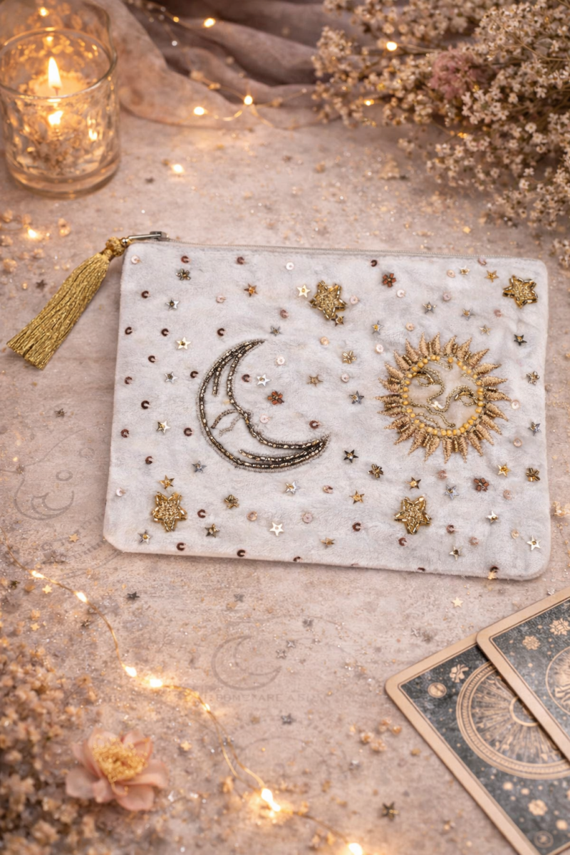 Manche Dinge tragen wir nicht nur bei uns – wir bewahren sie mit Bedeutung und Achtsamkeit. Diese liebevoll gestaltete Samttasche ist mehr als ein schöner Begleiter. Sie ist ein kleiner kosmischer Raum für all das, was dir wichtig ist.