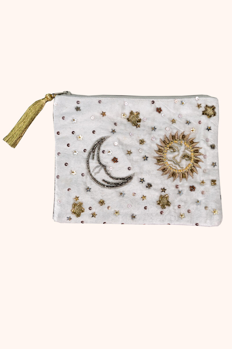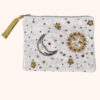 Feine Sterne, goldene Details und schimmernde Verzierungen lassen diese Tasche wirken wie ein kleines Stück des nächtlichen Himmels. Eine edle goldene Quaste am Reißverschluss setzt dabei einen besonderen Akzent und verleiht der Tasche eine elegante, fast magische Ausstrahlung.