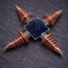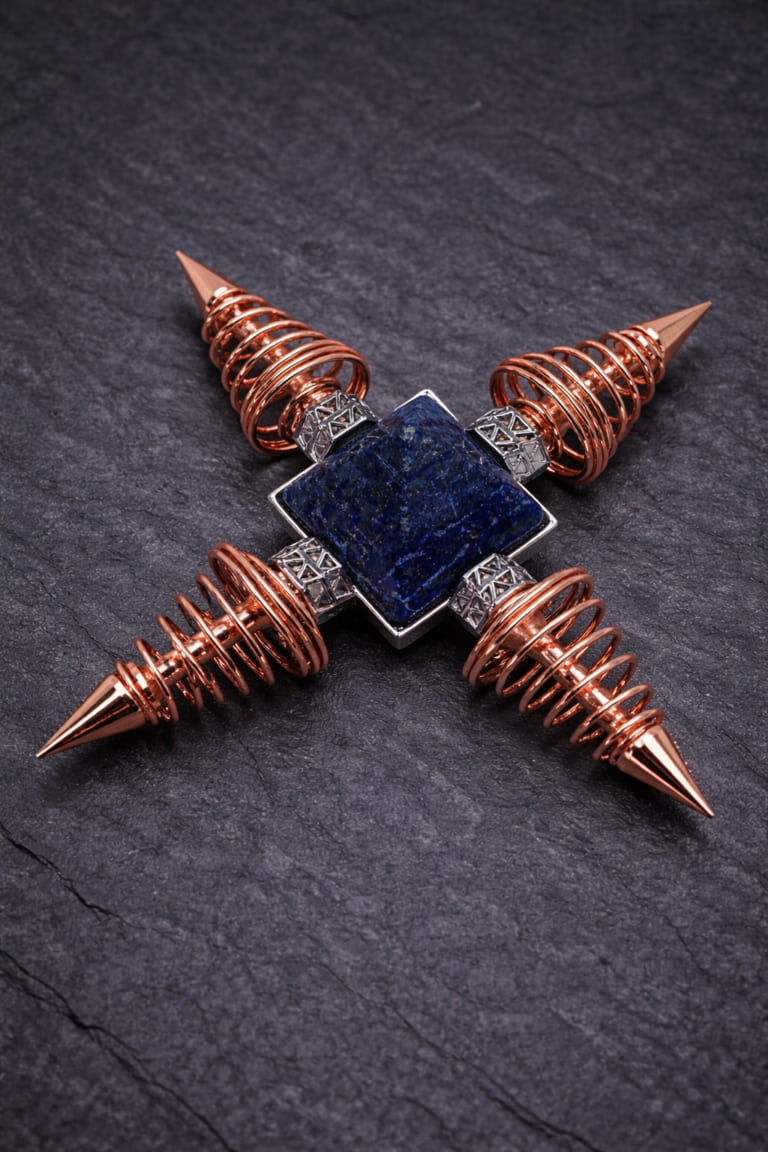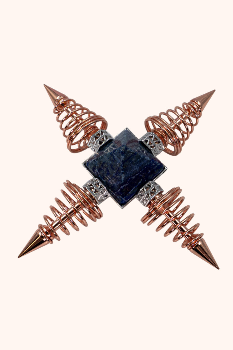 Das Energiekreuz mit Lapislazuli steht für geistige Klarheit und bewusste Ausrichtung. Die vier spiralförmigen Kupferelemente symbolisieren die Ausdehnung von Gedanken und Intuition in alle Richtungen – verbunden durch den zentralen Kristall.