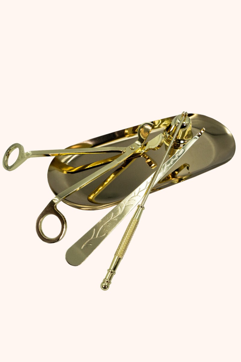 Die edlen, goldfarbenen Edelstahl-Werkzeuge stehen symbolisch für Wertigkeit und Bewusstsein im Umgang mit Licht und Feuer. Sie helfen Dir, Deine Kerzen achtsam zu pflegen und die Flamme in ihrer schönsten und ruhigsten Form zu halten: