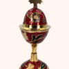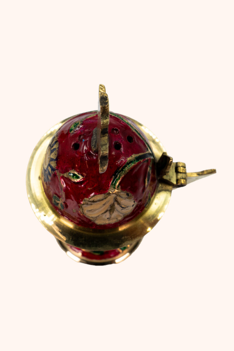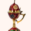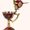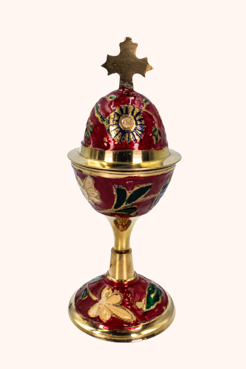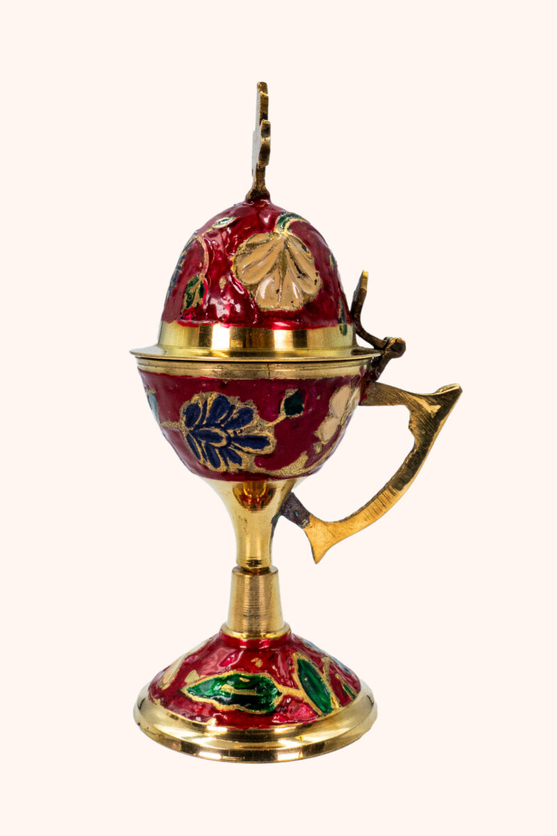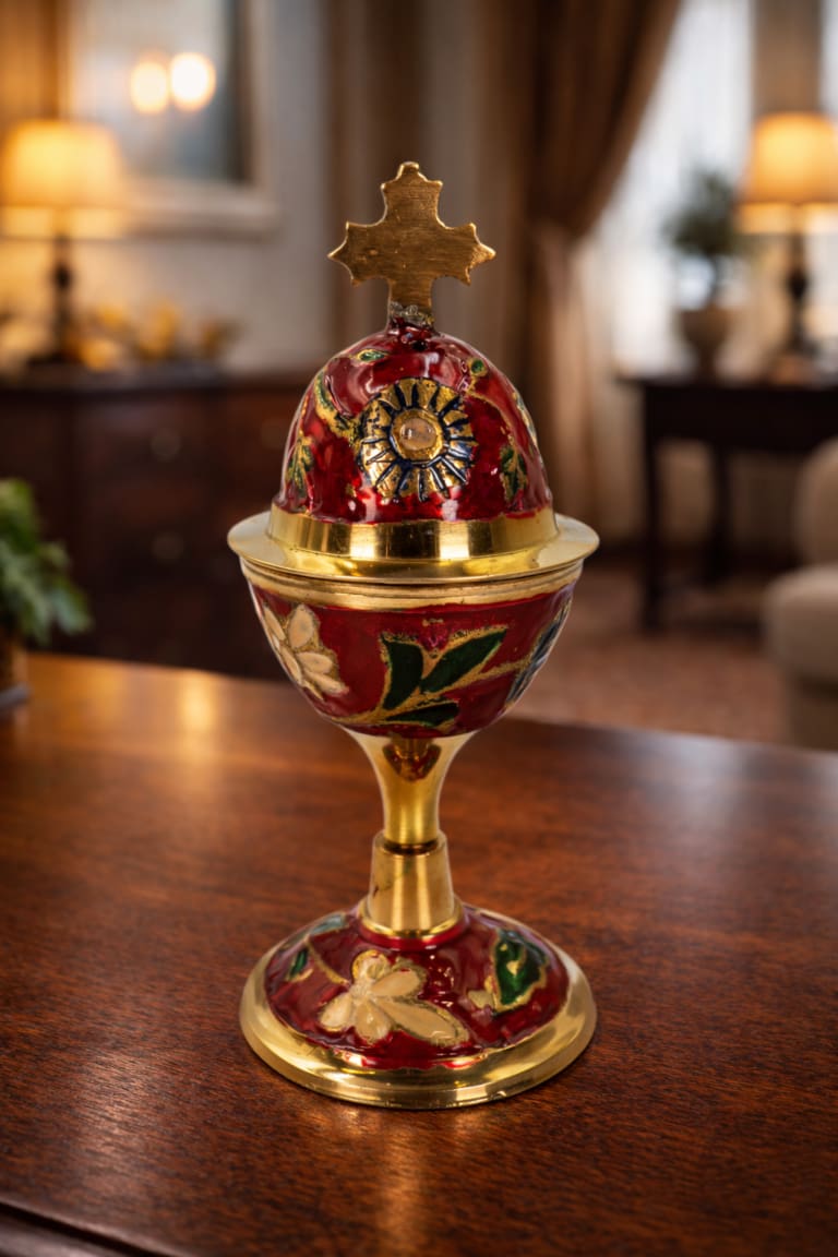 Der Tempelkelch Feuerenergie trägt genau diese Ausstrahlung. Sein warmes Rot, das goldene Metall und die kleinen Spuren der Zeit – feine Verfärbungen und winzige Makel – verleihen ihm eine besondere Tiefe. Es ist, als hätte dieser Kelch bereits viele Rituale, Gebete und stille Momente der Einkehr begleitet.