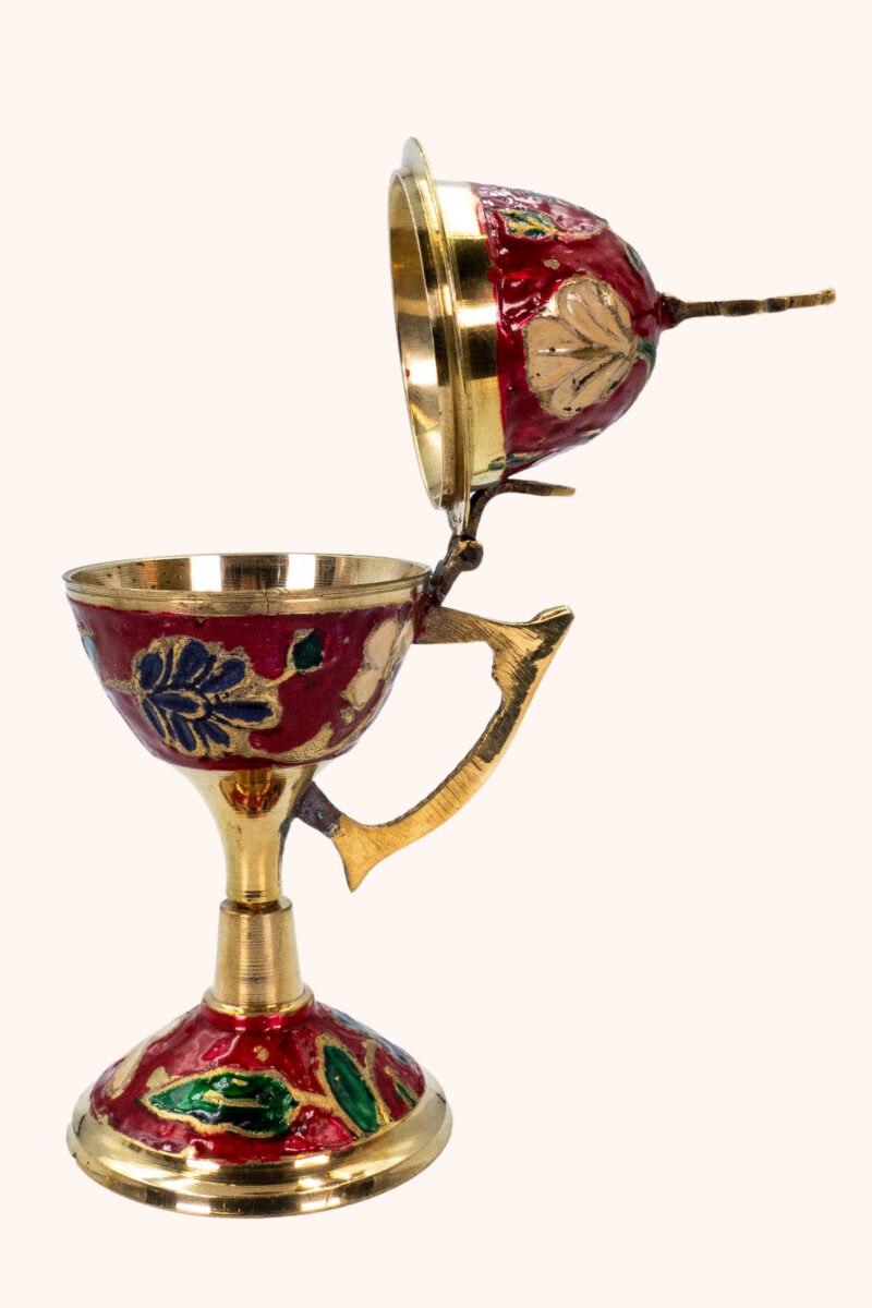 Der Kelch ist ein dekoratives Ritualgefäß. Kleine Unregelmäßigkeiten, Farbnuancen oder Metallverfärbungen sind Teil seines besonderen Charakters und stellen keinen Qualitätsmangel dar.
