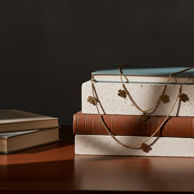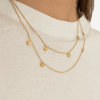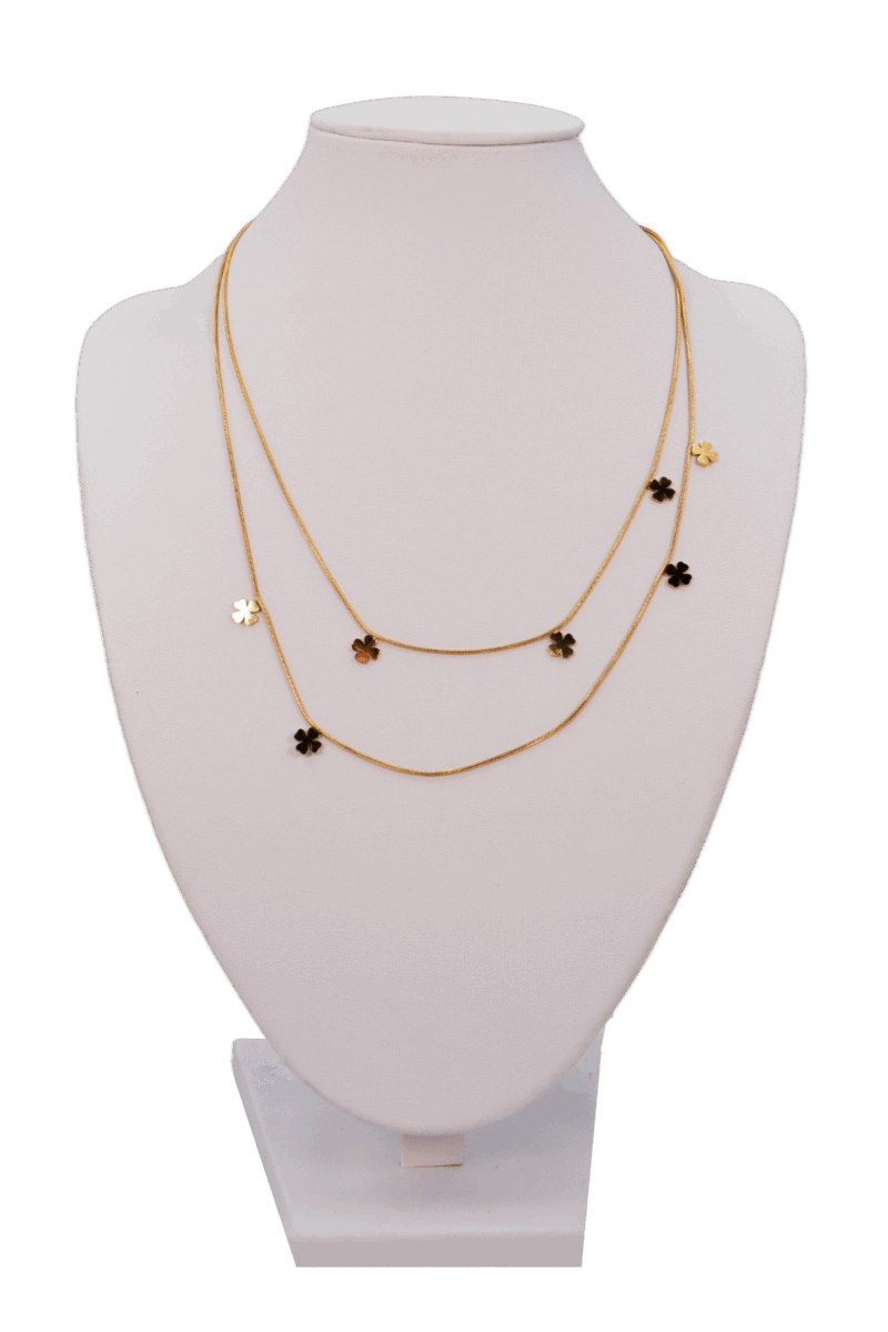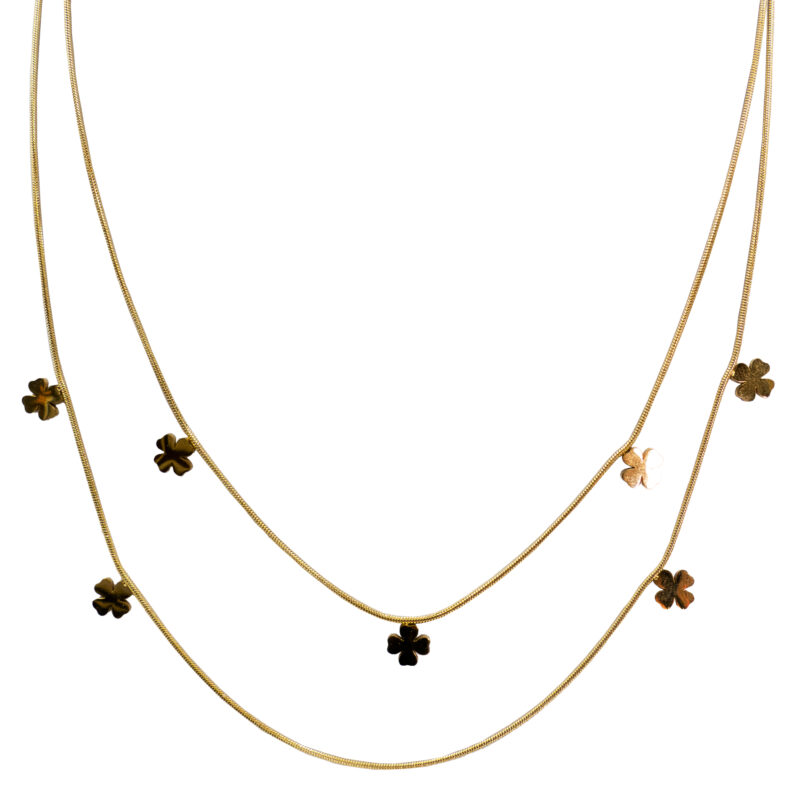 Feine, doppellagige Ketten schmiegen sich sanft an deine Haut, geschmückt mit kleinen, goldfarbenen Kleeblättern – zarten Symbolen des Glücks, der Hoffnung und der Fülle.