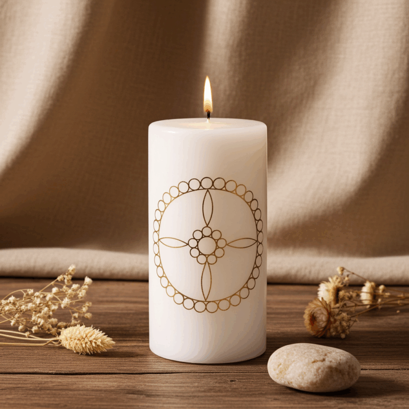 Die edle Wohlstandskerze trägt ein goldenes Lichtkristall-Symbol, das für die Energien von Fülle, Reichtum und innerem Wachstum steht. Jeder Kreis, jede Linie ist ein Schlüssel, der das Bewusstsein an die Ströme des Wohlstands erinnert, die im Universum frei fließen.
